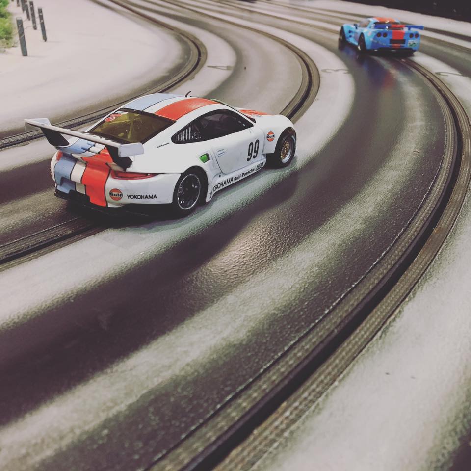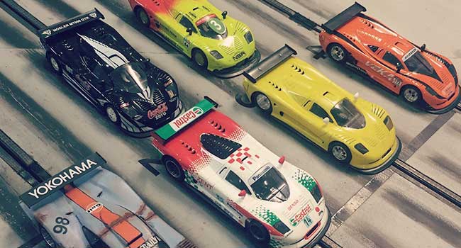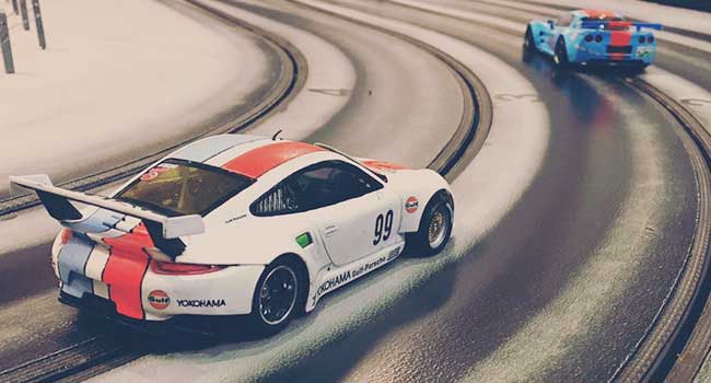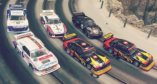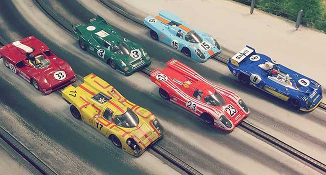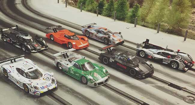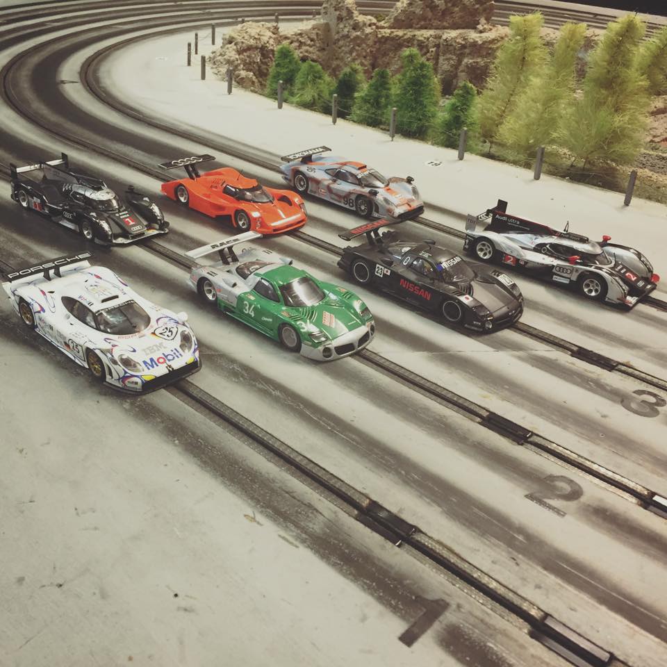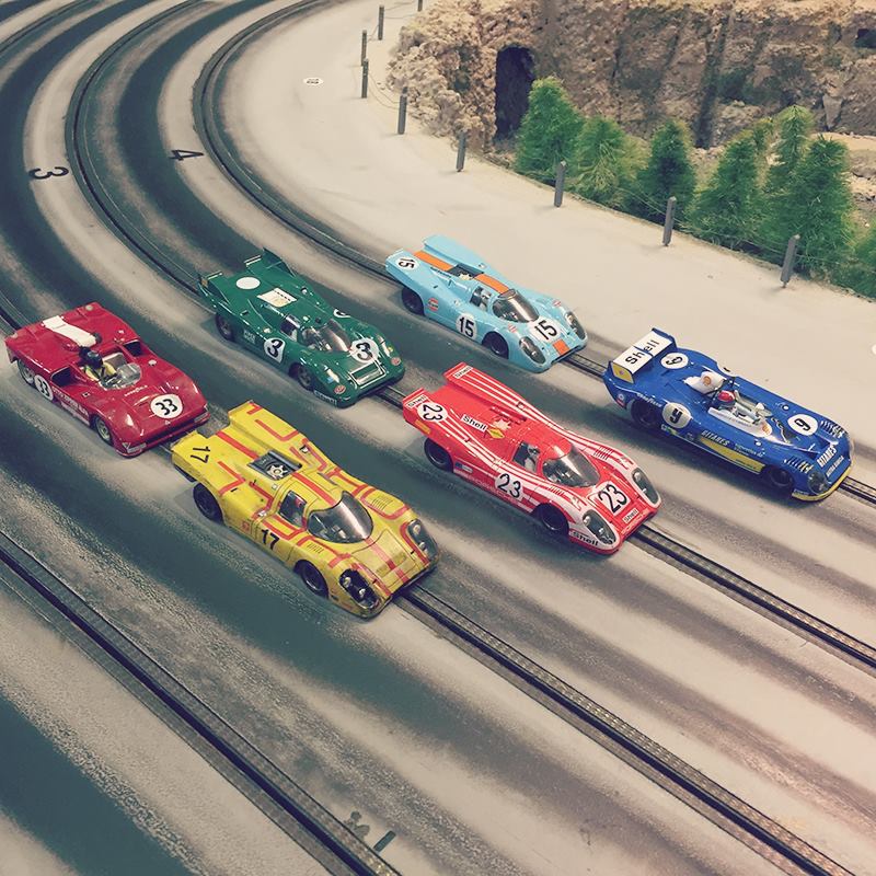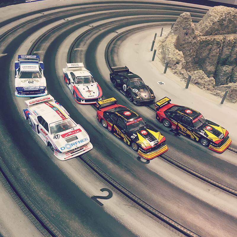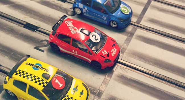 Racing med modelbiler på fire spors træ racerbane